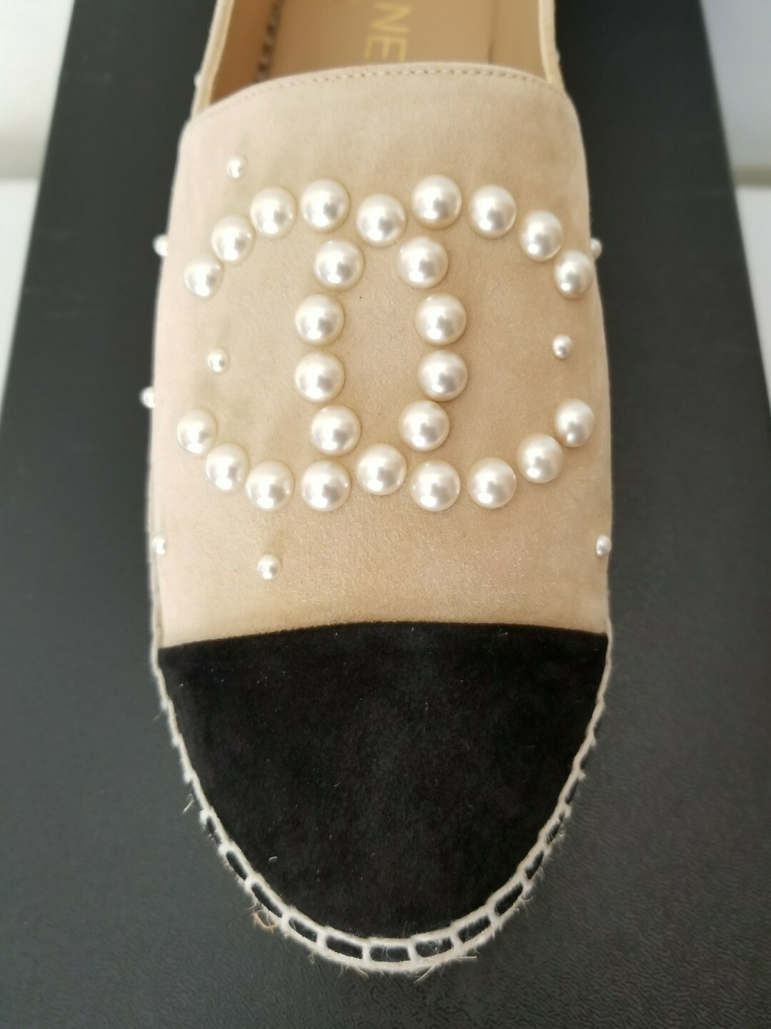 CHANEL ICONIC RARE BEIGE BLACK SUEDE chanel slip on espadrilles